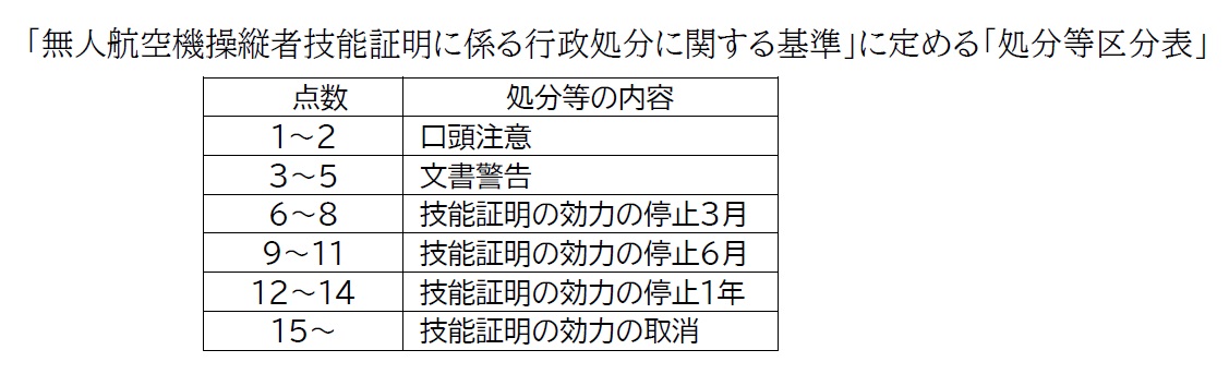 3.1 航空法全般 航空法に関する各論 (3)無人航空機の操縦者等の義務 5) 行政処分等 「無人航空機操縦者技能証明に係る行政処分に関する基準」に定める「処分等区分表」