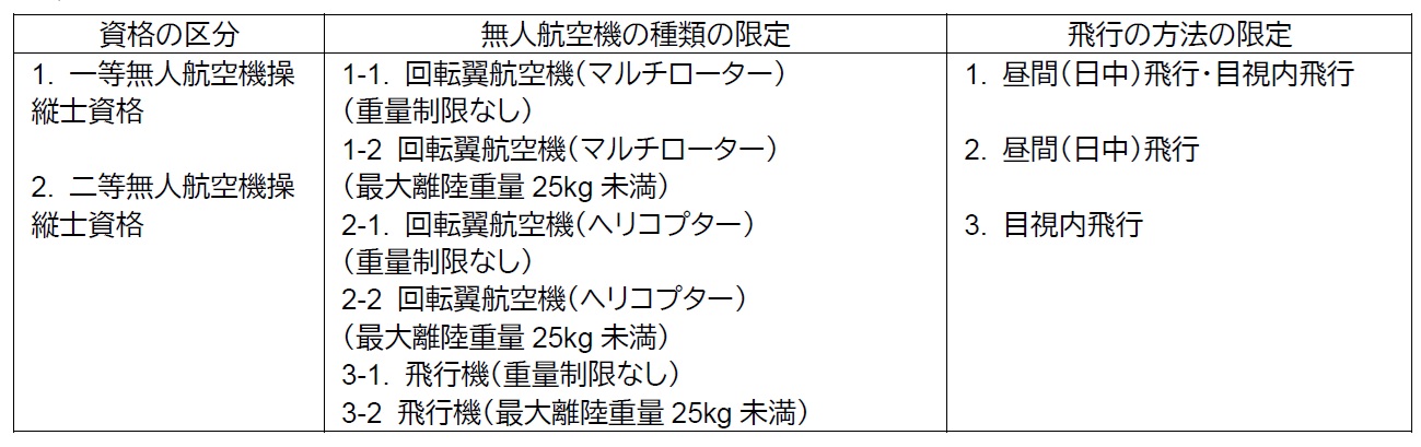 技能証明は、カテゴリーⅢ飛行に必要な技能に係る一等無人航空機操縦士とカテゴリーⅡ飛行に必要な技能に係る二等無人航空機操縦士の2つの資格に区分され、それぞれの資格において、無人航空機の種類(6種類)及び飛行の方法(3種類)について限定をすることとしている。