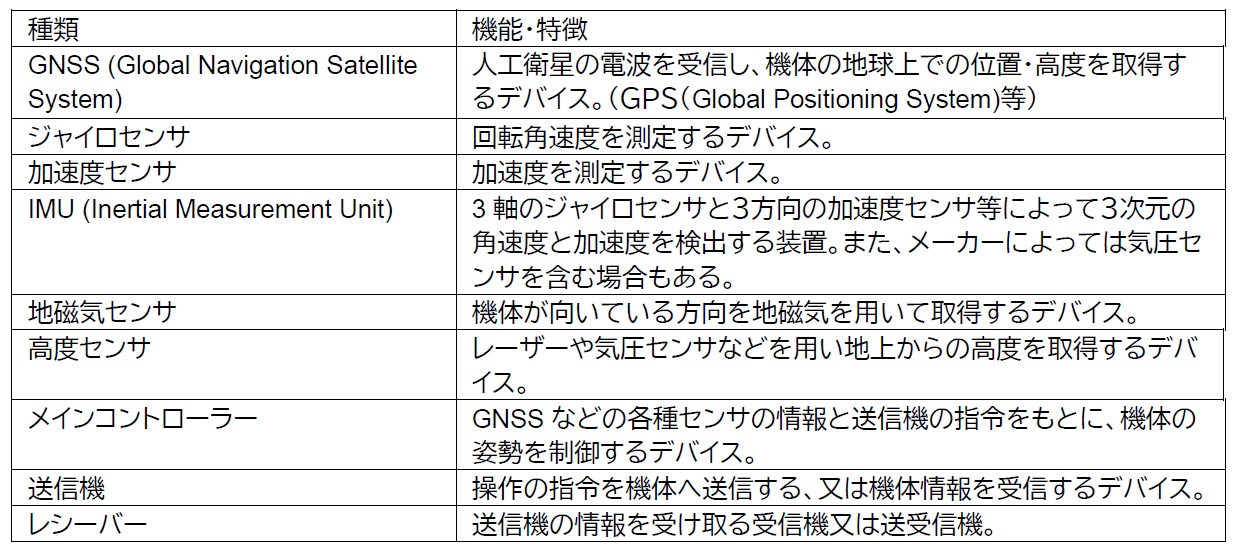 フライトコントロールシステムは、搭載されている各種センサ(GNSS、ジャイロ、加速度、方位、高度等)からの情報や送信機から発信された情報を処理し機体を制御するための信号を送るシステムである。なお、センサ類は、キャリブレーションを必要とするものが多いため、各機体で指定された方法で、キャリブレーションが正しく行われているかを常に注意する必要がある。フライトコントロールシステムを構成する一般的なデバイスには以下のものがある。